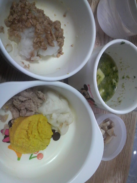 納豆おかゆ、ツナコーンパンの和洋コラボです
