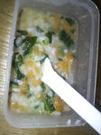 おかゆとレバー、人参、じゃがいも、さといも、たまねぎ、ほうれん草、グリーンピースを